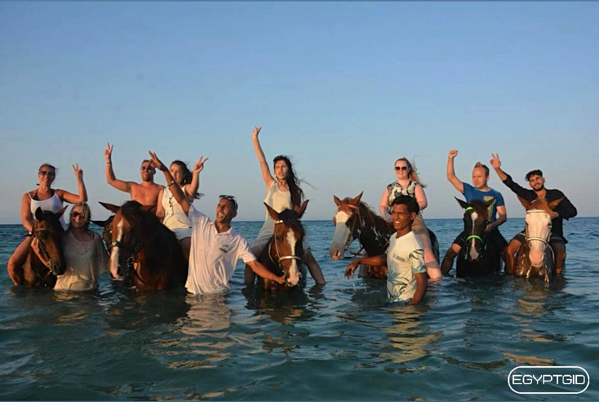 Трансфер заберет вас около 16:00 из отеля и отвезет в отдаленный район города Эль Ахея. Здесь вас ждёт купание на лошадях на закате и катание на верблюдах вдоль моря — уникальная возможность ощутить атмосферу Востока и сделать впечатляющие фото. Далее — отдых в бедуинской палатке, оформленной в традиционном стиле. Здесь подают бедуинский чай, арабский кофе, свежие финики и воду.